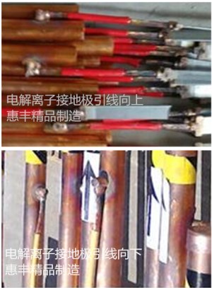 电解离子接地极的引线向下是一种常规的焊接方式,优点是焊接容易操作,运输方便;缺点是施工时降低了电解离子接地极垂直向下的长度,直接影响到接地电阻。
