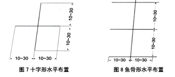 如图1-4,分一字形、口字形、十字形及鱼骨形。特别要指出的每根水平接地体之间的距离不应小于5米,否则有屏蔽作用,影响降阻效果。此法适用于地形狭窄,但能深挖或有条件使用机械钻孔的情况。